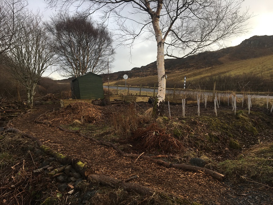 All the scrub, willow and rhododendron have been cleared (roots and all) and much of the brush chipped for use as mulch on the paths. A willow layered hedge has been created along the bank of the burn and the start of a low wall in front, which will also double as a seating area. A collection of fruit trees have been planted along both sides of the entrance path along with a wind break of native hedging shrubs in one of the most exposed corners.